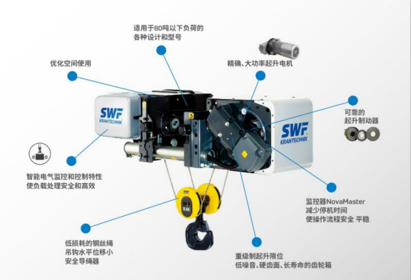 NOVA Silverline是SWF鋼絲繩葫蘆的旗艦產(chǎn)品。此系列產(chǎn)品優(yōu)化使用空間、操作高效、性價比高。NOVA silverline選項多、擴(kuò)展性強(qiáng)、能適合各種工業(yè)應(yīng)用??筛鶕?jù)不同客戶的需求,配置其功能。