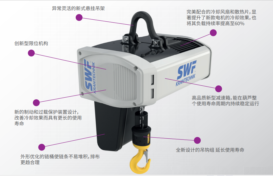新款起升電機和全新設計的散熱片提供了更好的冷卻效果,繼而延長使用壽命。 此外,ATHLO系列頗具匠心的限位觸發(fā)機構(gòu)設計新穎葫蘆 ,使 限位無論是在常規(guī)使用抑或極端條件下均能完美工作。
